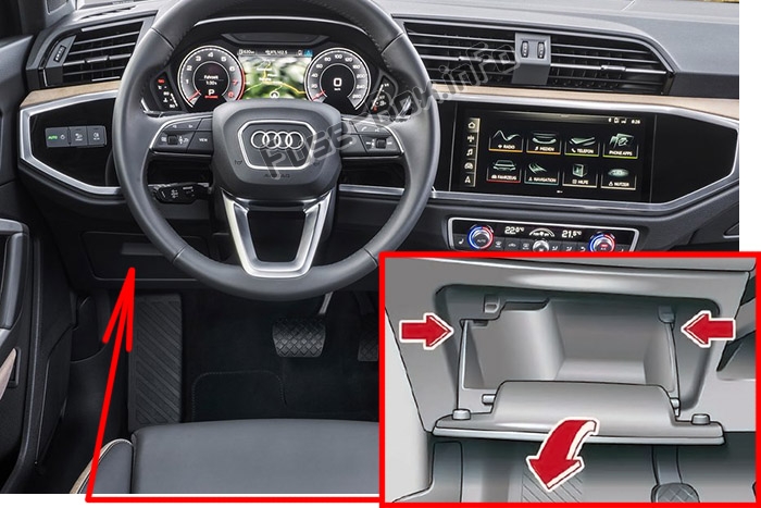 Рулевое управление слева: Блок предохранителей расположен за отделением для хранения на стороне водителя.