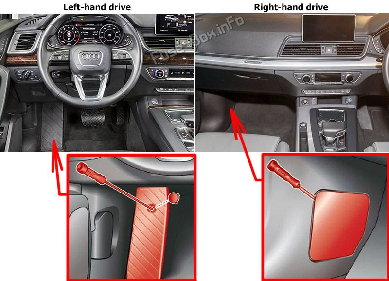 Предохранители расположены в области под ногами под подставкой для ног (автомобиль с левым рулем) или за крышкой (автомобиль с правым рулем).