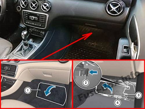 Блок предохранителей расположен под полом рядом с пассажирским сиденьем (снимите коврики и покрытие).Расположение предохранителей в салоне: Mercedes-Benz A-Class (2013-2018)