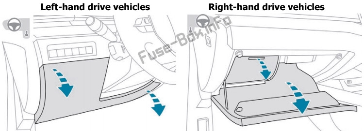 Откройте бардачок, нажмите на центральную ручку крышки блока предохранителей, полностью опустите крышку.