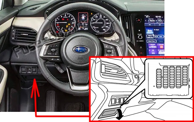 Он расположен за крышкой ниже и слева от рулевого колеса.Расположение предохранителей в салоне: Subaru Legacy / Outback (2020...)