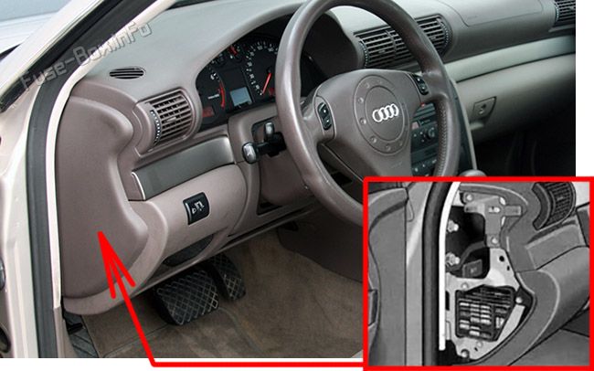 Предохранители расположены за крышкой на стороне водителя.Location of the fuses in the passenger compartment: Audi A4 / S4 (1998-2001)