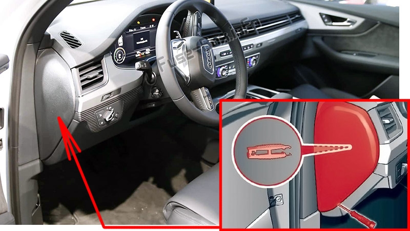 Левый руль Блок предохранителей в нише для ног (LHD): Audi Q7 (2016, 2017, 2018, 2019)