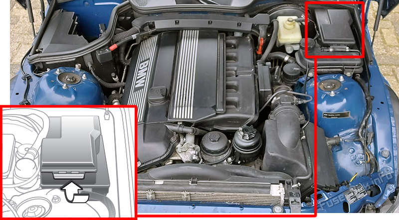 Блок предохранителей (центр распределения электроэнергии) расположен с левой стороны моторного отсека. Нажмите на удерживающий клапан и снимите крышку для доступа.