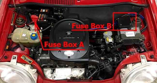 Блок предохранителей B, содержащий еще три предохранителя, расположен в моторном отсеке с правой стороны.
