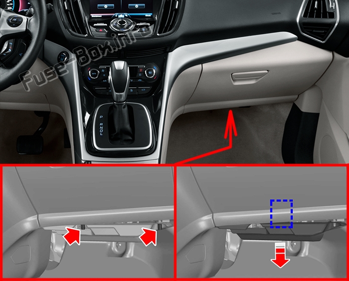 Блок предохранителей расположен под бардачком (зажмите фиксаторы для снятия крышки, опустите крышку и потяните ее на себя).