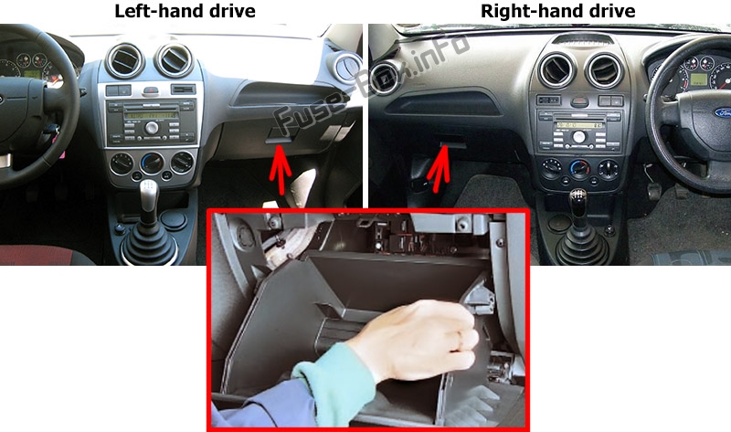 Блок предохранителей расположен за бардачком. Откройте бардачок, сожмите его стенки и опустите вниз.