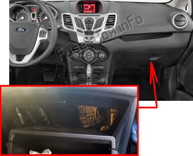 Откройте бардачок, нажмите на боковые стороны внутрь и опустите бардачок вниз.The location of the fuses in the passenger compartment: Ford Fiesta (2011-2013)