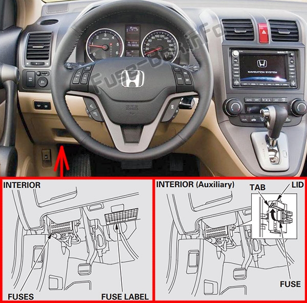 Наклейка с предохранителями прикреплена под рулевой колонкой.The location of the fuses in the passenger compartment: Honda CR-V (2007-2011)