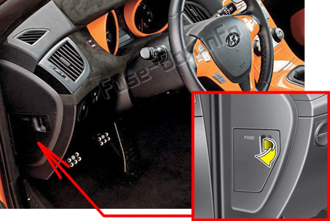 Блок предохранителей расположен на стороне водителя панели приборов, за крышкой.The location of the fuses in the passenger compartment: Hyundai Genesis Coupe (2009-2016)