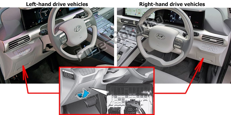 Блок предохранителей расположен на стороне водителя панели приборов за крышкой.Расположение предохранителей в пассажирском отсеке: Hyundai Nexo (2019-..)