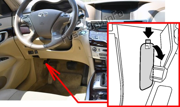 Блок предохранителей расположен за крышкой под приборной панелью.Расположение предохранителей в салоне: Infiniti M37, M56 (2010, 2011, 2012)