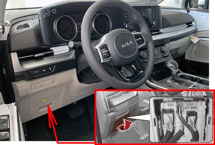 Блок предохранителей расположен в панели на стороне водителя. Откройте крышку панели предохранителей.Расположение предохранителей в салоне: Kia Carnival (2021, 2022, 2023)