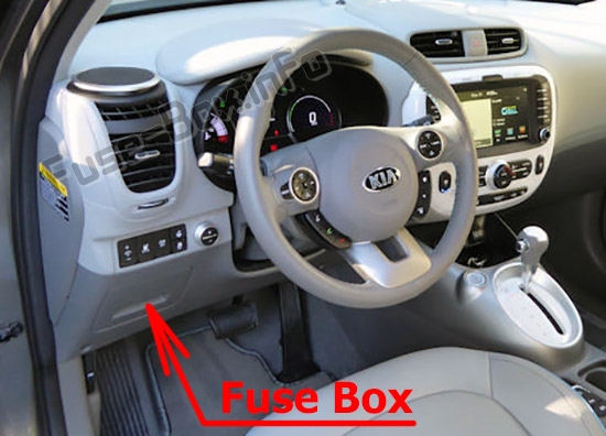 Блок предохранителей расположен за крышкой на стороне водителя панели приборов.Расположение предохранителей в пассажирском отсеке: KIA Soul EV (2015-2019..)