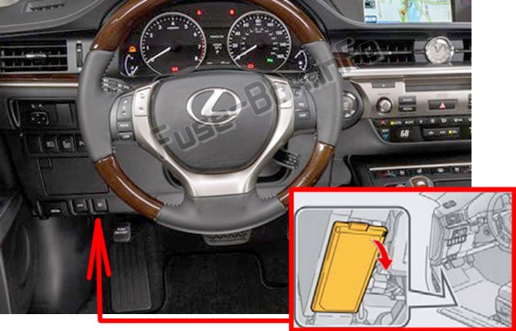 Блок предохранителей расположен под приборной панелью (со стороны водителя), под крышкой.The location of the fuses in the passenger compartment: Lexus ES250 / ES350 / ES350h (XV60 / AVV60; 2012-2015)