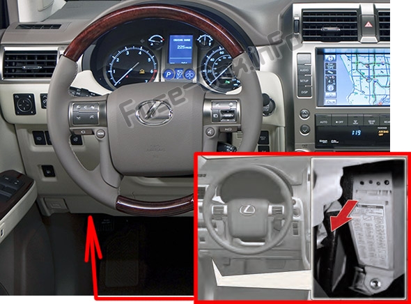 Он расположен под приборной панелью (со стороны водителя), под крышкой.