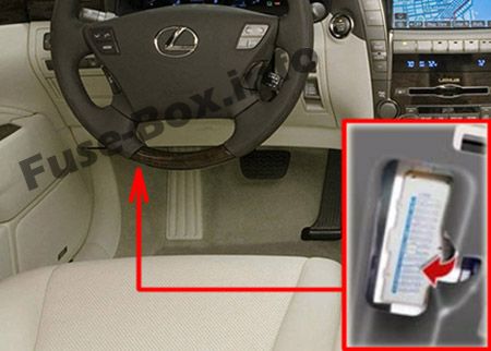 Расположен под правой стороной приборной панели, под крышкой.Расположение предохранителей в салоне: Lexus LS 460 (2007, 2008, 2009)