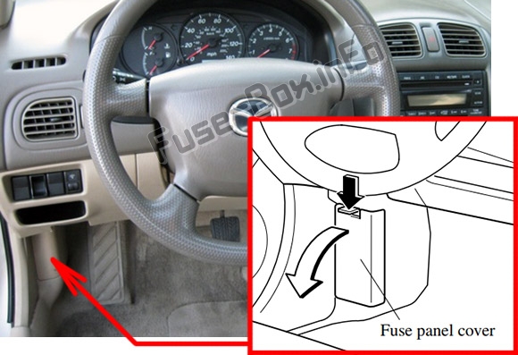 Расположен на левой стороне автомобиля, за крышкой.Расположение предохранителей в салоне: Mazda Protege (2000-2003)