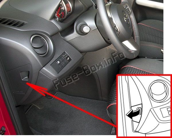 Блок предохранителей расположен за крышкой с левой стороны приборной панели.Расположение предохранителей в салоне автомобиля: Mazda 2 (DE; 2007-2014)