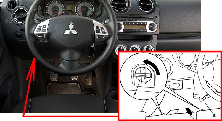 В автомобиле с правым рулём, он расположен на задней стенке бардачка. Откройте бардачок, нажмите на фиксатор (A) и снимите крышку (B).Location of the fuses in the passenger compartment (RHD): Mitsubishi Colt (2002-2008)
