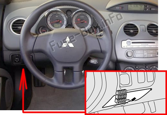 Блок предохранителей расположен на стороне водителя на приборной панели, за крышкой.Расположение предохранителей в салоне автомобиля: Mitsubishi Eclipse (4G; 2006-2012)