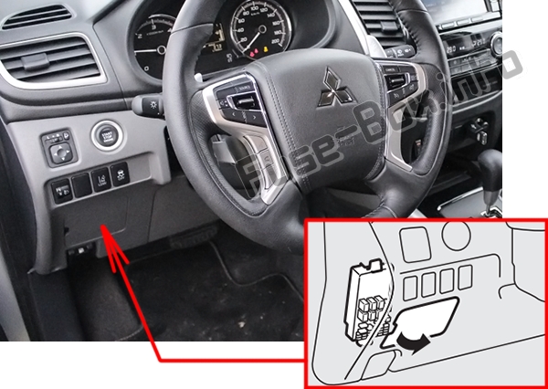 Блок предохранителей расположен в панели приборов (левая сторона), за крышкой (Потяните за крышку предохранителей, чтобы снять ее).The location of the fuses in the passenger compartment (LHD): Mitsubishi L200 (2017-2018..)