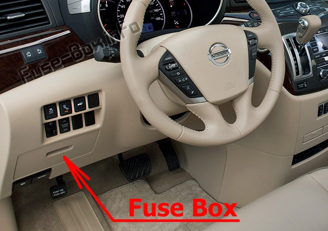 Коробка предохранителей расположена за крышкой на стороне водителя приборной панели.Расположение предохранителей в салоне: Nissan Quest (2011-2017)