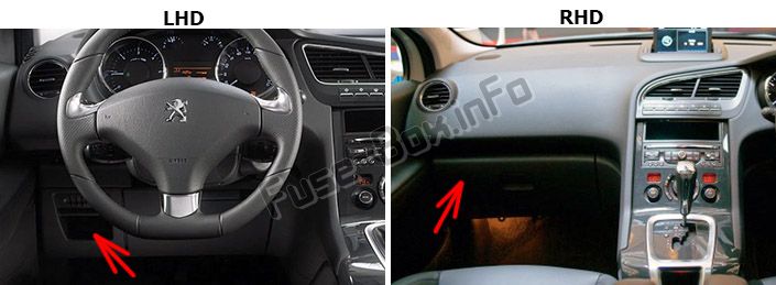 Автомобили с левым рулем: блок предохранителей расположен в нижней части приборной панели (слева).