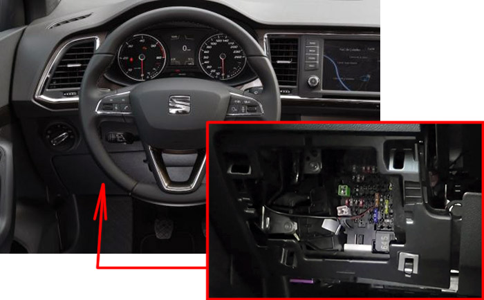 Блок предохранителей расположен за отделением для хранения.Расположение предохранителей в салоне (LHD): SEAT Ateca (2016-2019-...)