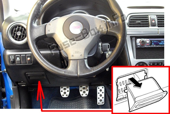 Блок предохранителей расположен за крышкой слева от рулевого колеса.Расположение предохранителей в салоне автомобиля: Subaru Impreza (2001-2007)