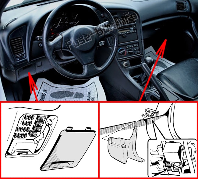 В салоне автомобиля расположены два блока предохранителей. Первый находится за крышкой на панели приборов, а второй — за крышкой на боковой панели со стороны пассажира.Расположение предохранителей в салоне: Toyota Celica (1993-1999)
