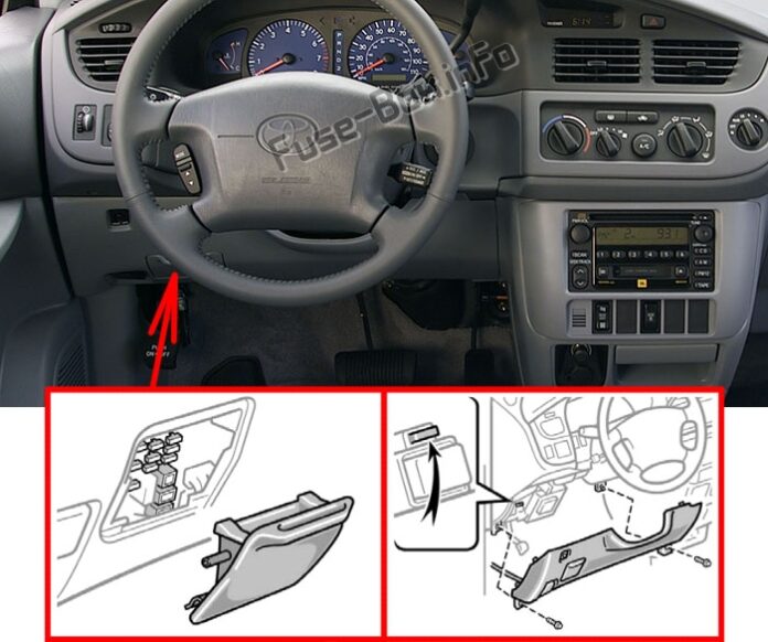 Он расположен за крышкой слева и ниже рулевого колеса. Слева от него находится еще один предохранитель, чтобы получить к нему доступ, необходимо снять панель под рулевым колесом.The location of the fuses in the passenger compartment: Toyota Sienna (1998-2003)