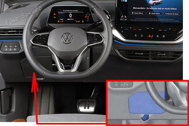 - Нажмите кнопку фиксации в направлении стрелки (стрелки), чтобы разблокировать крышку блока предохранителей (1);